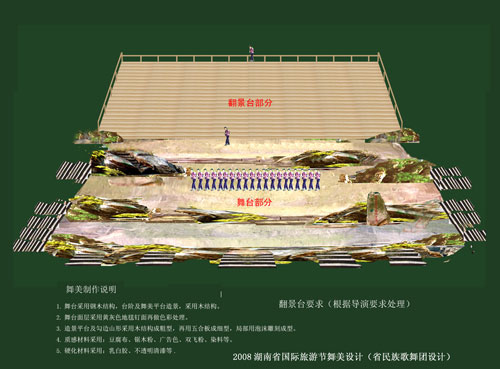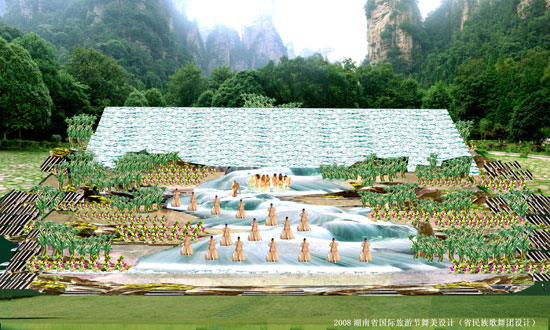 (本網(wǎng)訊)7月28日,經(jīng)過近一個月的設(shè)計創(chuàng)作,湖南省民族歌舞團舞美設(shè)計師舒千龍完成2008中國湖南國際旅游節(jié)大型實景演出“擺手舞天下”舞臺、舞美設(shè)計,并制作出多角度效果圖。2008中國湖南國際旅游節(jié)總導(dǎo)演陳偉康及本屆旅游節(jié)開幕式場地組組長姜陽春等專家反復(fù)進行了論證,在與2008中國湖南國際旅游節(jié)執(zhí)委會的確認,最終方陣與舞臺整體設(shè)計方案塵埃落定。