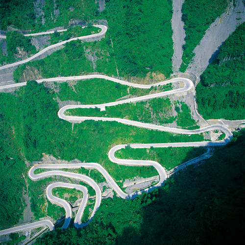 天門山國家森林公園位于張家界市區(qū)南郊,其核心景點(diǎn)通天大道歷時(shí)8年修建,公路自天門山山門廣場(chǎng)始,至天門洞止,公路共有99個(gè)彎道,180度的彎路環(huán)環(huán)相連、層層迭起,氣勢(shì)雄偉。建設(shè)公路過程中又為減少植被破壞,整個(gè)工程充滿著艱辛卓絕,以蜿蜒迂回穿行于山體絕壁之天險(xiǎn)而成為天下第一公路奇觀。中國書法家協(xié)會(huì)名譽(yù)主席沈鵬先生走過通天大道后欣然為其題字“曲道通天”,字體遒勁挺拔,與通天大道的奇絕天下相融為一體。