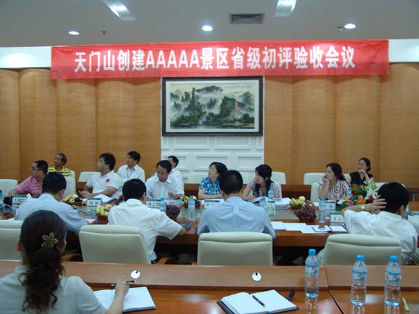 8月12日上午,天門山創(chuàng)建AAAAA景區(qū)省級(jí)初評驗(yàn)收會(huì)議在天門山索道下站會(huì)議室召開。省旅游局副局長劉之明,省旅游局規(guī)劃處處長尚斌,省旅游局規(guī)劃財(cái)務(wù)處處長李志斌,省旅游局規(guī)劃財(cái)務(wù)處副處長黃可,省旅游局規(guī)劃財(cái)務(wù)處副主任科員王朝暉以及衡陽市旅游局規(guī)劃科科長王玲代表省評定組出席了會(huì)議。張家界市副市長肖凌之,張家界永定區(qū)區(qū)長陳競,張家界永定區(qū)副區(qū)長張?jiān)诜,張家界市旅游局局長丁云勇,張家界市旅游局副局長谷中元,張家界區(qū)旅游局局長吳文斌等張家界市區(qū)相關(guān)領(lǐng)導(dǎo)也出席了會(huì)議。
