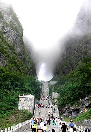 選擇乘索道游覽天門山是最佳視角。索道吊廂一出站房,馬上就騰空飛了起來,從城市的一棟棟樓頂掠過,猶如在城市上空滑翔。翻過一道山梁之后,城市被遠(yuǎn)遠(yuǎn)拋在了視線以外,大片翠綠的稻田映入眼簾,透過打開的通風(fēng)窗口,一陣陣青草水田特有的清香沁入心脾;蚋呋虻偷霓r(nóng)舍不時(shí)從我們身下滑過,牛羊們?nèi)齼蓛捎崎e的在田間浮動(dòng)著,靜謐、安詳。再翻過一座山峰,我們便立即被滿山的青翠所包圍,萬仞絕壁也已投懷送抱。索道支架矗立于絕壁天險(xiǎn)中,或挺立或傾倒或探頭或擁抱,我們繼續(xù)在艱險(xiǎn)中游歷,時(shí)而隱沒于云堆,時(shí)而出世于蒼穹。這時(shí)你除了那滿懷的驚險(xiǎn)刺激外有的便只有望索而興嘆了。我拍了很多片子,但是總覺得還是沒有足以記錄下來這座空中盆景的壯麗。