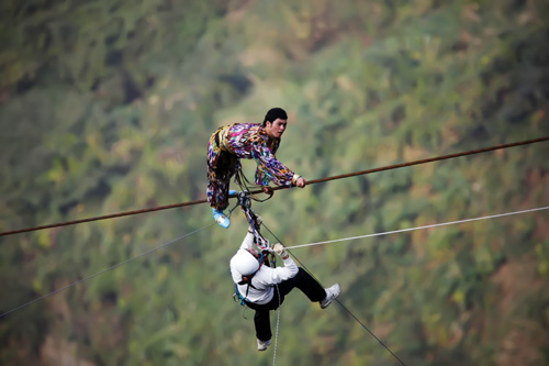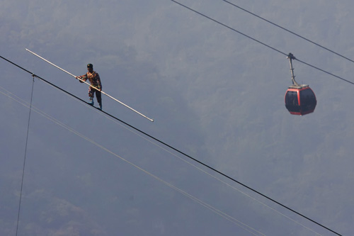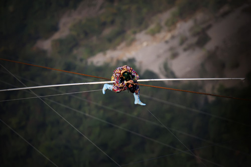 10月18日,新疆達瓦孜傳人賽買提·艾山在張家界天門山景區(qū)進行目前世界最大坡度39°高空鋼絲的極限挑戰(zhàn)的途中發(fā)生意外,在距離終點約50米處跌坐在鋼繩上,最終被迫放棄挑戰(zhàn)。具精確統(tǒng)計,本次挑戰(zhàn),賽買提·艾山行走的長度為650米,鋼繩坡度為39°,所用時間為49分鐘,雖然沒有到達原計劃的700米終點,但是他也已成功挑戰(zhàn)了目前世界最大的高空鋼絲坡度39°。意外發(fā)生后,天門山景區(qū)預先安排的安全人員立即展開救援,歷時1個多小時將賽買提-艾山順利從鋼繩上救下。