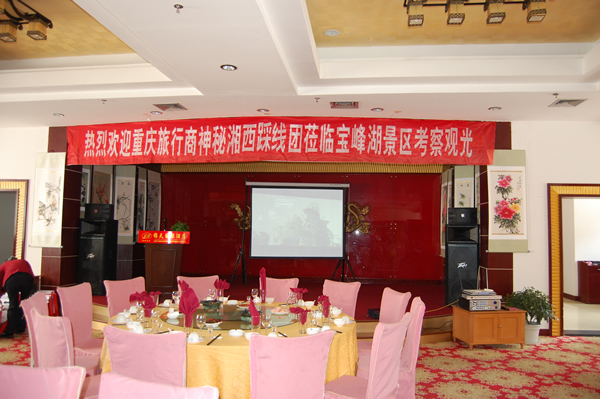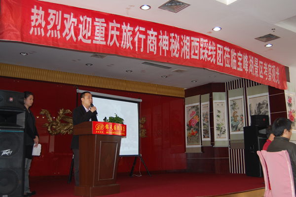 2009年3月29日,來自重慶的旅游商會(huì)、江北區(qū)旅游局及13家旅行社等100人考察商在走訪了神秘湘西之后抵達(dá)人間仙境張家界,來到山歌的海洋--寶峰湖。寶峰湖景區(qū)總經(jīng)理童鈞、營銷總監(jiān)任建華、張股公司湘西片區(qū)營銷總監(jiān)劉英杰全程陪同。 游覽過程中,考察團(tuán)對奇峰飛瀑的壯觀、土家山歌的婉轉(zhuǎn)動(dòng)人給予了高度評價(jià)。泛舟湖上,孔雀開屏、半臉八戒、金蟾含月等都令其贊不絕口。游至送客松,當(dāng)導(dǎo)游介紹到寶峰神女的時(shí)候,所有人都發(fā)出感慨:真是世間絕景--其外形亭亭玉立,婀娜多姿,從湖面兩米處往上看,那邊扁平的部分神似一位美女臉部的左側(cè),她目光凝視前方,緊緊抿著的櫻桃小嘴、高高挺起的鼻梁,似乎正在對這湖水梳妝打扮,二頭上的那部分便是高高盤起的發(fā)髻。 考察結(jié)束后,雙方就對重慶與張家界兩地的旅游文化進(jìn)行交流,在兩地旅游資源的共享與互補(bǔ)上達(dá)成共識(shí),一致認(rèn)為在以后要緊密合作,攜手打造精品旅游,更好的帶動(dòng)兩地的旅游發(fā)展。