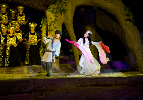 《新劉?抽浴肥鞘澜缟系谝慌_以高山奇峰為舞臺背景,以山澗峽谷為表演舞臺的山水實景演出;也是目前世界第一臺有完整故事情節(jié)的山水實景音樂歌舞劇。大型山水實景音樂劇取材于中國經(jīng)典的神話傳說和民間故事,汲取世界豐富的音樂文化元素和表現(xiàn)形式,輔之以現(xiàn)代高科技的舞臺特效技術(shù),是對世界音樂歌舞劇的一次成功的創(chuàng)新,成為中國山水實景演出的劃時代巨獻(xiàn)。