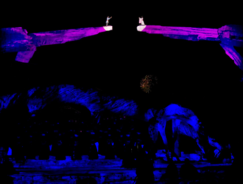 本項目觀眾劇場及主舞臺總占地面積19880平方米,其中全景舞臺10000平方米,采用玻璃鋼設(shè)計,通過燈光效果可通體透亮,營造出奇幻場景。整個表演區(qū)包括:中心舞臺、左側(cè)的人間世界,右側(cè)的狐貍世界、左前歌隊歌臺、后演區(qū)梯田與木橋?qū)嵕肮参鍌演區(qū)。