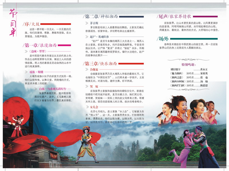 張家界魅力湘西旅游開發(fā)有限責任公司,成立于2000年,主營大型民族歌舞史詩——《張家界•魅力湘西》。公司旗下?lián)碛心壳叭珖畲蟮奈幕糜窝菟嚮亍獜埣医琪攘ο嫖鲊H文化廣場。該廣場總投資2.5億元,占地31.22畝,劇場座位數(shù)2600個,每晚兩場演出座無虛席,深受觀眾好評。《張家界•魅力湘西》,由黃永玉題名,宋祖英、張也、陳思思三位湘籍歌唱家擔任藝術(shù)顧問并演唱主題歌。目前,公司共有員工285人,其中大專以上學(xué)歷占70%,擁有很高的職業(yè)素質(zhì)和專業(yè)技能。