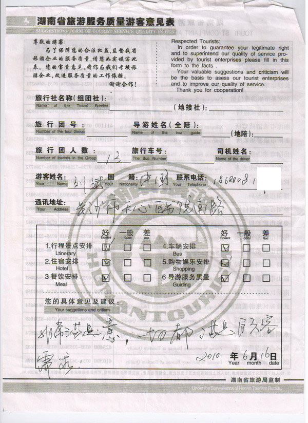 長沙劉斌一行13人旅游質量回饋:非常滿意,一切都滿足顧客的需求!