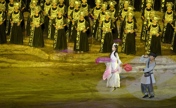樂聲響起,霧嵐飛煙在奇峰間縈繞,飛瀑流泉在峽谷里奔涌,花草樹木在翩翩起舞,100位銀飾盛裝的土家少女在歡快靈動的大自然中聲如天籟,講述著那被清風(fēng)傳送了千年萬載的愛情故事: