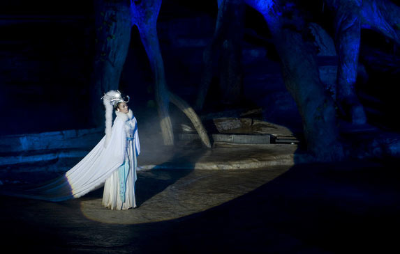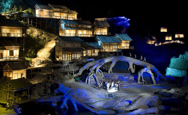 劇中的中心舞臺搭建在溪谷之上,望之就如一顆橫臥的古樹浮于涓涓溪流之上,與周圍的天然山石完美相融。舞臺面積總10000平方米,不僅是目前全球最大的演出舞臺,而且全部采用玻璃鋼設(shè)計,燈光照射下通體透亮、色彩變換,營造出一幕幕令人驚異的奇幻場景。