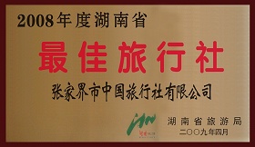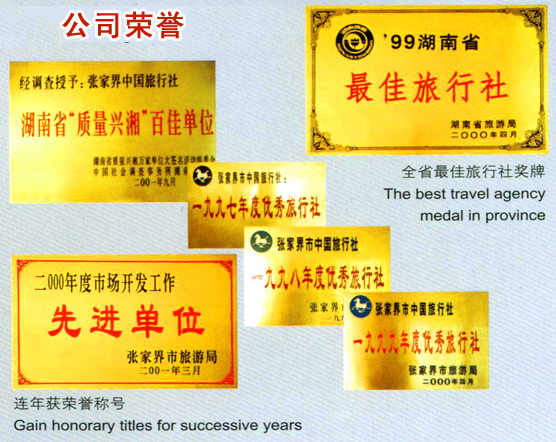 張家界市中國旅行社自1984年成立以來,至今保持年接待量、旅游收入、上繳稅費居同行業(yè)前茅的記錄,并多次被“省、市評為最佳旅行社”、“重合同守信用單位”、“質量信得過單位”、“旅游接待優(yōu)勝單位”、“雙文明單位”。