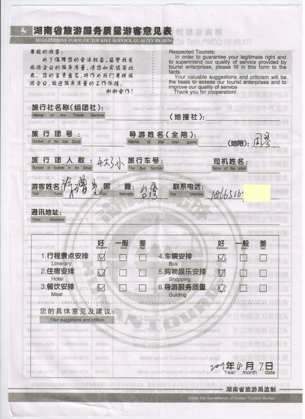 臺灣徐先生一行7人旅游質(zhì)量回饋