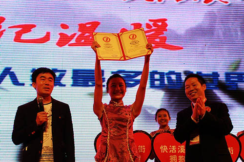 當晚,張家界溪布街彩燈妖冶,人流如織,不同膚色,不同服飾的男女老少,游客商賈,儷伉情侶,云集在溪布街,盡情享受“白果樹下愛情夜”。他們或乘坐彩船,在索溪河蕩漾一腔幽情;或呼朋引伴,在主會場表演搶親鬧;或登臨閨樓,窺覓著精致漂亮的繡球;更有楞頭小伙,干脆擁擠在各十字街口,等待那將創(chuàng)世界紀錄少女們的世紀相擁……溪布街,正描繪著休閑、激情、浪漫、唯美的幅幅畫面。