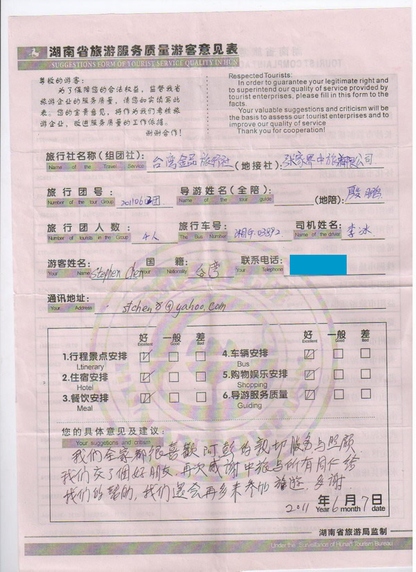 臺(tái)灣stephenchen先生一行4人旅游質(zhì)量回饋