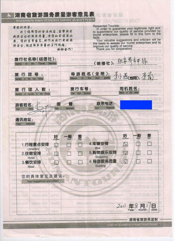 廣東李先生一行5人旅游質(zhì)量回饋:
