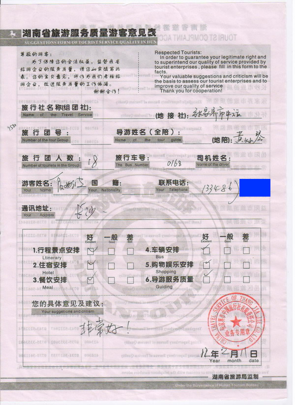 長(zhǎng)沙夏先生一行18人旅游質(zhì)量回饋