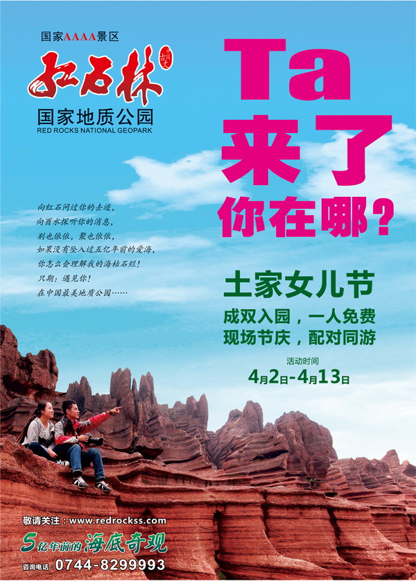 如果你是戀愛人士或已婚,那么恭喜你,將在4月2日—13日期間享受“情侶一票”或“家庭免一票”的優(yōu)惠,和你心愛的他(她)來一場“踩腳定親”吧。別吝嗇你的愛,“秀愛有獎”環(huán)節(jié)還將見證你們在紅石林那“海枯石爛情亦堅”的不渝愛情。
