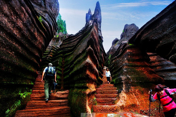 走進(jìn)紅石林,猶如探進(jìn)一個(gè)迷幻而又神秘的世界,景區(qū)石林奇特、峰叢怪異,石柱、河流、湖泊、暗河、瀑布、洞穴、巖溶、洼地多彩多姿、色彩斑斕、層次分明、絢麗壯觀,石林的顏色且隨季節(jié)而變:晴紅雨黑、陰轉(zhuǎn)褐紅、晨昏有別、季變色變、變幻多端、造型各異、古樸雄奇、嘆為觀止,不愧為五億年前海底世界之珍藏。
