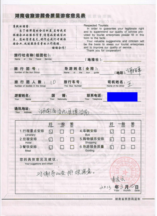 湖南李小姐一行10人旅游質(zhì)量回饋單