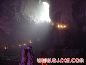 17個國家的20多名洞穴專家三次下九天洞考察,探出洞里面可供游覽的面積是250多萬平方米,分為上、中、下三個主體層次(我們現(xiàn)在 處在第一層,第二、三層還在下面)最低層低于地面470米,洞內(nèi)有三條陰河,十二條瀑布,十五個潭,二口龍井,五座自生橋,六塊千丘田,三個天然湖,五個池,十余座洞中山,三十六個大廳等等。目前這個洞僅開發(fā)了整個面積的十分之一,也就是說我們今天的游覽面積是25萬平方米左右,這其中,我們能看到四個天窗和六個大廳(其它五個天窗和大廳在尚未開發(fā)的地方),整個游程是8華里(4公里)路,兩個小時左右,請大家做好心理準備。