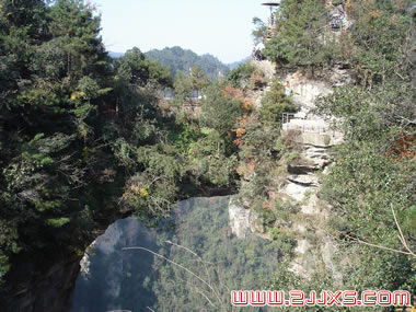 “后花園”至天下第一橋,有一條全長2000多米的游道,路面多為白色的條石鋪成,站在遠(yuǎn)處觀望,很像一條白色的綢帶打了兩個結(jié),一頭系在“迷魂臺”,一頭第在“天下第一橋”。信步漫游,沿途可欣賞到“拜仙臺”、“百丈絕壁”、“小洞天”、“情人谷”等別有情趣的景點,這里海拔不高,一般不受氣候影響,慢慢品味,定會使您賞心悅目。