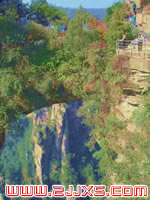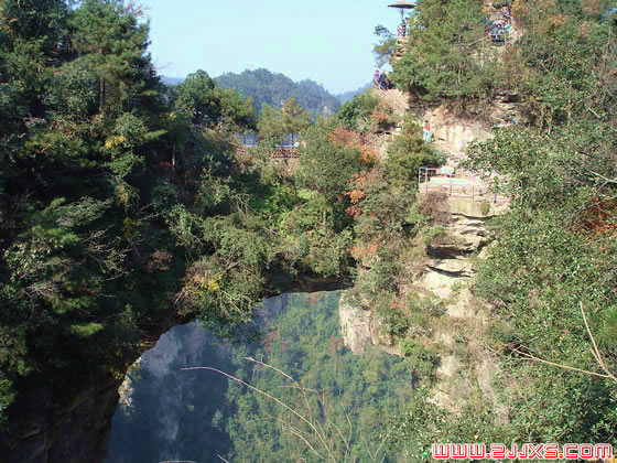 一天然石橋,位于張家界袁家界景區(qū),處砂刀溝風(fēng)景區(qū)一帶,屬?gòu)埣医缇A景點(diǎn)。大自然的鬼斧神工,將一塊厚約5米的天然石板,橫空“架”在兩座山峰之上,把東西兩峰連接。橋高350米,是張家界最高的石橋。高度、跨度和驚險(xiǎn)均為天下罕見,故稱“天下第一橋”。橋長(zhǎng)20米,寬僅1.5至3米不等,但較平坦,可通行人。橋上蒼松挺拔,橋下云霧蕩漾,萬丈深淵。四周懸崖絕壁,水滴飛濺。踏上橋面,使人有凌空御風(fēng)之感。手扶鐵欄桿,仰視,青峰飄渺于云靄繚繞之中;俯瞰,奇峰如筍群,巖壑深谷中陣陣煙嵐泛起,散而復(fù)聚。此景點(diǎn)名稱出于八十年代中到此游覽的一位美國(guó)旅行家之口。