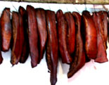 苗家人有一種隔年熏臘肉的習(xí)慣。每年臨近年關(guān),殺了年豬,將豬肉切成三至五斤一塊,擦上鹽和各種香料后腌三至五天,待鹽及香料浸進(jìn)肉內(nèi),再用竹條或藤條穿串掛到火坑上,以煙火慢慢熏干。熏制得比較好的臘肉一般可保存半年以上。如用桔子皮熏烘,臘肉油中透紅,紅中透亮,不見煙灰,顏色更顯好看。臘肉做菜前須洗凈,煮熟、蒸軟、再切片,既可直接蘸酸湯辣子食用,也可加佐料翻炒,香味獨(dú)特,菜色亦佳。