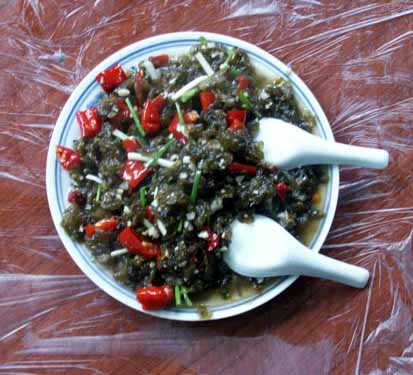 當(dāng)?shù)卮合募居旰,山頭巖石壁上生長(zhǎng)的墨綠色地菇——地衣(本地名為沙蘿菇),采集后用清水反復(fù)多沖洗幾次。再用壇子腌的酸辣椒和大蒜一起炒熟,出鍋后灑些許香蔥即成一道色、香、味俱全的地方特色小吃。