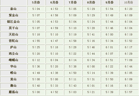 很多旅游者在游覽名山時都把觀日出作為一項重要活動來安排,但有時千心萬苦地的爬到山頂,卻由于時間掌握的不準,錯過了良機。上表是從5月到10月共14個觀日點的日出時間,是以每月的16日來計算的。因為各種因素,誤差在所難免,提前幾分鐘到目的地為好。