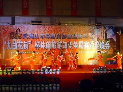 2007年1月3日晚,武夷山市導(dǎo)游協(xié)會迎新年暨“九曲花街杯”休閑旅游知識爭霸賽頒獎晚會在武夷山市體育館隆重舉行,南平市旅游局局長張章景、武夷山景區(qū)管委會主任陳先珍、武夷山市副市長黃安民等領(lǐng)導(dǎo)及武夷山市旅游界、“九曲花街杯”休閑旅游知識爭霸賽入圍獎獲得者二千多人參加了晚會。