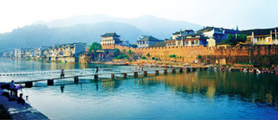 翻過山梁的時候,看到一座停留在時光里的小城,在夕陽下寧靜無語。沱江就從這座小城當(dāng)中流過。河邊有城墻、吊腳樓。河面不寬,卻清澈見底。河里長滿了碧綠的水草,隨著水流輕輕地擺動。水面上不時冒出小小的氣泡,那是魚蝦在歡快地游玩。捕魚的、游覽的小船來來往往,各得其所。