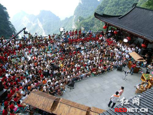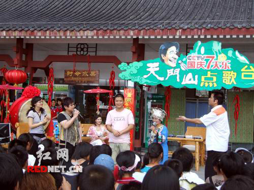 下午三點,節(jié)目錄制正式開始。在天門洞下的露天平臺上,央視著名主持人畢福劍——老畢以虛擬的“畢路電視臺天門山點歌臺”臺長的身份詼諧登場,他把他的“畢路電視臺”幽默的解釋為:姓畢的創(chuàng)辦的電視臺和必須錄制的節(jié)目,“畢路電視臺天門山點歌臺”這次請來了鄭智化和于文華兩位著名歌手,他們以觀眾點歌的形式,進(jìn)行現(xiàn)場“PK”,充分展現(xiàn)“國慶七天樂,點歌也快樂”的節(jié)目主題。