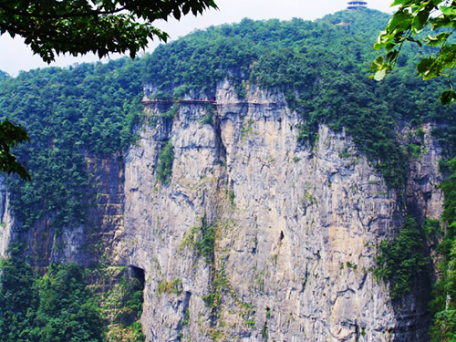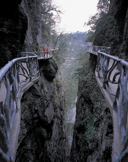 —— 在一個(gè)小鳥(niǎo)也飛不到的地方,將尖叫進(jìn)行到底 鬼谷棧道,位于覓仙奇境景區(qū),因懸于鬼谷洞上側(cè)的峭壁沿線而得名. 棧道全長(zhǎng)1600米,平均海拔為1400米,起點(diǎn)是倚虹關(guān),終點(diǎn)到小天門(mén).與其他棧道不同的是,鬼谷棧道全線既不在懸崖之巔,也不在懸崖之側(cè),而是全線都立于萬(wàn)丈懸崖的中間,給人以與懸崖共起伏同屈伸的感覺(jué). 站在棧道上俯瞰群山,古人“會(huì)當(dāng)凌絕頂,一覽眾山小”的感覺(jué)油然而生.由于天門(mén)山是國(guó)家森林公園,植被特別豐富,加上典型的喀斯特地貌,所以,在這條棧道上更能找到一種在乘坐直升飛機(jī)飛越熱帶雨林大峽谷的感覺(jué),這平時(shí)只能在電影里看到的場(chǎng)景,在這里能讓你身臨其境. 由于海拔和氣流的影響,很多小鳥(niǎo)都不能到達(dá)與棧道平行位置.所以,站在這里,腳下是沒(méi)有邊際的綠野,成群的小鳥(niǎo)在峽谷中嬉戲,偶爾有老鷹從眼前掠過(guò),閉上眼,挺著發(fā)麻的雙腿,帶著急促的心跳,伸開(kāi)雙臂,你就能得到一次最完美,最刺激,最貼近自然的SPA.因?yàn)?要知道這種在懸崖上賞風(fēng)景一般都是非人類(lèi)所能享受的. 如果是雨前雨后,在棧道上則是身邊霧氣盤(pán)繞,腳下云海翻騰,令人抬腿似生霧,邁步如踏云,人間天界,世外洞天也就是如此了. 據(jù)施工人員介紹,此條棧道也是他們所修棧道中施工最難,最險(xiǎn)峻的一條.如果您還覺(jué)得不夠刺激的話,在棧道的完結(jié)處的兩個(gè)懸崖之間有一條長(zhǎng)160米的懸索吊橋,同時(shí),在海拔最高點(diǎn)還有一個(gè)挑戰(zhàn)心里極限的玻璃站臺(tái),在這里,如果你能挺直腰板伸開(kāi)雙臂,那么,您就是真正的勇士了.