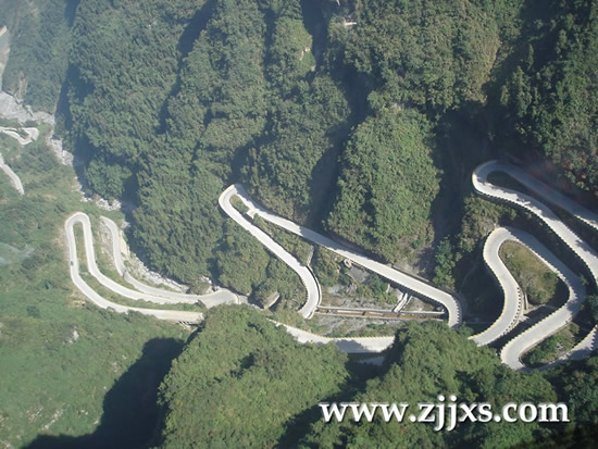 通天大道 通天大道共計九十九彎,扣合天有九霄之意。大道借山勢扶搖直上,如巨龍翔起,似玉帶斜掛,一百八十度急彎回巒盤繞,堪稱天下第一公路奇觀。經(jīng)此通天大道,即可直達(dá)天梯,壯觀的天界氣象近在眼前。 Heaven-linking Avenue has 99 turns symbolizing that the Heaven has nine palasce.The avenue runs upward with the posture of the mountain like the soaring of great dragon and also hangs like a jade belt with zigzg turns circling the hills.It is worth the titleewonder of highway in the world.Through Heaven-linking Avenue,one reaches directly the Tianticelestial ladder.The grand celestial-like scene came into view.
