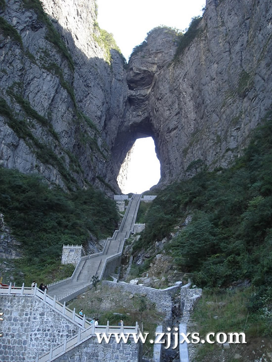 Tianmen Cave is the natural water-eroded cave with the highest elevation in the world.In the year 263(the sixth year of Wuyong Period of Three Kingdoms),the thousand-meter high cliff of Songliang Mountain suddenly broke open into a door-like cave which became a rare wonder of the world.Hence Songliang Mountain is change to Tianmen Mountain.