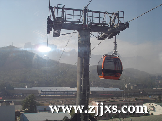 天門山索道 世界最長(zhǎng)的高山客運(yùn)索道天門山索道,共有轎廂98個(gè),索道支架57個(gè)(含3個(gè)救護(hù)支架),全部采用法國(guó)POMA公司原裝進(jìn)口設(shè)備。索道全長(zhǎng)7455米,高差1279米,是國(guó)內(nèi)為數(shù)不多高差超過千米的索道之一,其中站到上站之間的局部斜度更高達(dá)37度,世界罕見,是國(guó)內(nèi)局部斜度最大的索道,同時(shí)也是支架最多的索道。 Tianmen Mountain Cableway,the longest passenger cableway of high mountains in the world,has 98 cars and 57 brackets altogether(including 3 rescuing brackets),all of which are original imported facilities from POMA,the French corporation.The cableway has a total length of 7455 meters and a height gap of 1279 meters.It is one of the few cable cars within China with a height gap over 1000 meters. The local gradient from the middle station to the upper station is as high as 37 degrees,which is rare in the world.It is the cableway with the largest local gradient as well as one with most brackets in China.