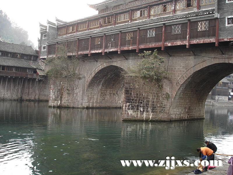 這座橋始建于明洪武初年,頗信風(fēng)水的鳳凰人都說(shuō),這座橋斬?cái)嗟氖且粭l龍頸,令一條巨龍身首異處。怪只怪那位和尚出生的安徽小子朱元璋,聽(tīng)信一位從昆侖山開(kāi)始追索一支龍脈,經(jīng)云貴高原來(lái)到五寨司城的陰陽(yáng)先生的讒言,說(shuō)這兒屏立南郊?xì)鈩?shì)非凡的南華山和與之一脈相承一頭扎入沱江的奇峰,就是他要尋找的龍頭。并由此推斷出總有一天這地方會(huì)有人出來(lái)問(wèn)鼎中原,真命天子將出。那位朱皇帝豈能允許邊遠(yuǎn)的鳳凰有他潛在的對(duì)頭?于是朱筆一勾,龍頸被斬,鳳凰風(fēng)水遭毀滅性破壞,鳳凰再也出不來(lái)皇帝了。