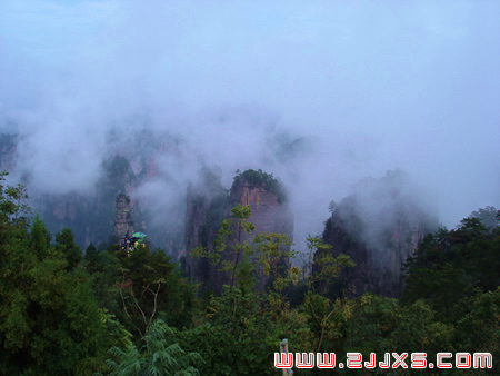 六奇閣是一幢塔狀的樓臺,突兀在石砌的方臺基上,登此閣可遠(yuǎn)眺張家界諸勝景,可是日陰云齊集,煙雨菲菲,登此閣僅能近望云海蒼茫,閣頂有一長須黑衣老丈攜妻在此擺了個臺,為游人題字留念,掙些筆資,三樓有一點歌臺,二位土家姑娘熱情地邀客點歌,從其張貼在墻的山歌篇目看,與山路上小孩所唱大同小異,故為所動者寥寥,頗為清閑。六奇閣以此處山奇、水奇、石奇、云奇,植物奇和動物奇而得名,想其獨特的峰林,高山泉,鴛鴦膝,華南虎均為鮮見之風(fēng)物,物以稀為貴,仍社會之規(guī)律,自然界一旦墜入紅塵也不能免俗了。