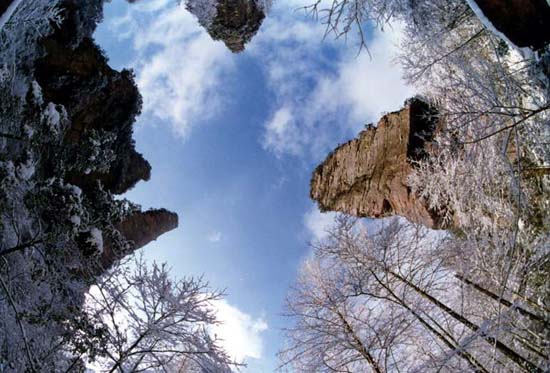 緊靠金鞭巖左側(cè),有一座與金鞭平齊的峰巖。峰形象一只山鷹,頭高昂,勾嘴,雙翅半展,利吻微張,試振雙翅, 成俯沖之勢,緊緊守護(hù)著金鞭,似欲與來犯金鞭者搏擊,其形態(tài)氣勢,維妙維肖。故有“神鷹護(hù)鞭”之譽(yù)。