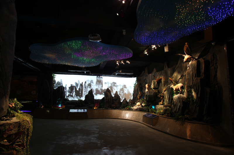 展廳右側(cè)為一幅張家界全景水墨長卷,以多媒體投影的云霧輔助全景畫的形式為游客描繪了一幅奇峰競秀、奇花爭妍、云煙繚繞、溪水潺潺、珍禽競翔、鳥啼蟬鳴的張家界。畫里的山石自然延伸到了畫外,一些珍禽異獸的標本從巖石的縫隙中探出身來,在燈光的襯托下既靈動、神秘又切合主題。