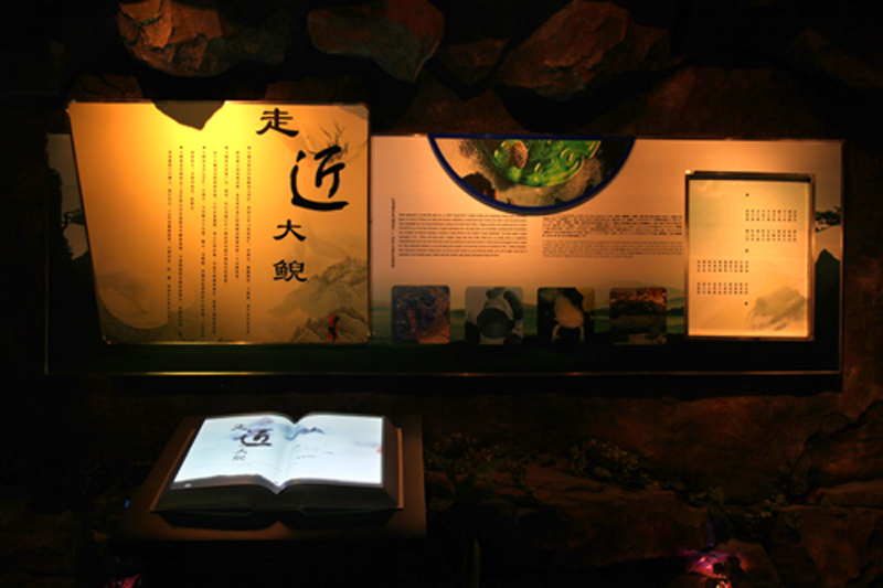 本展項是介紹大鯢各方面知識的圖文展板,展板前特別設(shè)置了一本《走近大鯢》的電子書,電子書深入介紹了大鯢的形態(tài)特征、生活習性等豐富的知識點。展墻對面是一個展示了大鯢標本的展臺。本展項通過展板結(jié)合標本的形式,以靜態(tài)結(jié)合互動的展示手段,讓游客全面獲悉大鯢的知識。