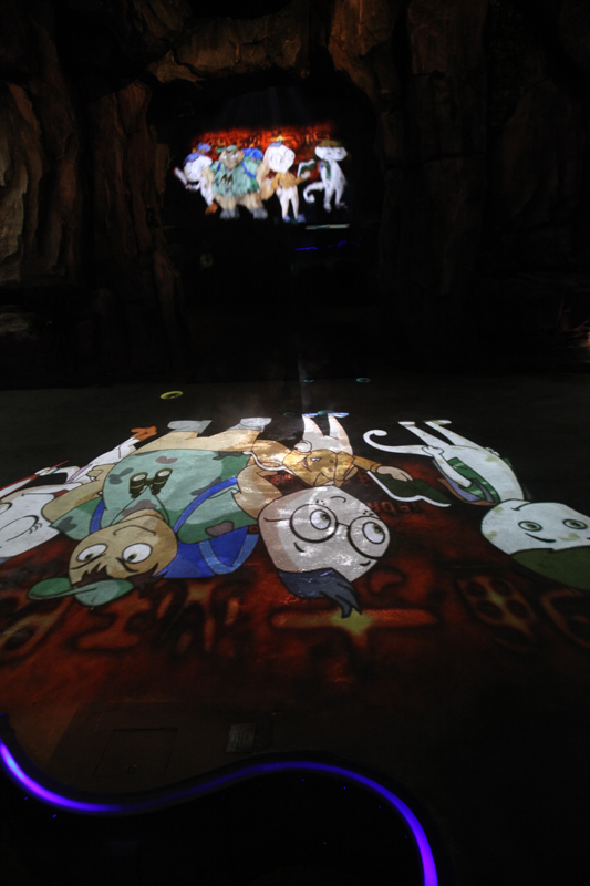 當游客進入到家園空間的最后階段的時候,家園四周的景象由秋天自然過渡到冬天,舉目一片白雪皚皚的景象;地面上投影效果也會變得白雪皚皚,游客在投影區(qū)域中走動會留下他們的腳印。