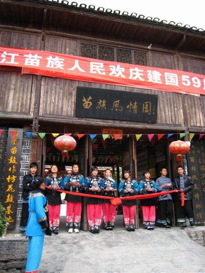 游鳳凰不到山江,你將終生遺憾。 苗族服飾最具特色是女裝。出門時,頭上戴著青絲帕,身上穿著滾邊繡花無領(lǐng)滿襟,滾邊繡花褲;頭帕和上衣綴滿銀飾,有銀帽、銀鳳冠、銀項圈、銀手鐲、銀戒子、銀牙釬、銀掛鏈、銀腰帶等,雍容華貴,落落大方。山江女裝,衣著色彩鮮麗,銀飾造型精美,是苗族女裝的精品。 攔門酒是苗家古老的習(xí)俗,一些地方直呼"識友酒"。